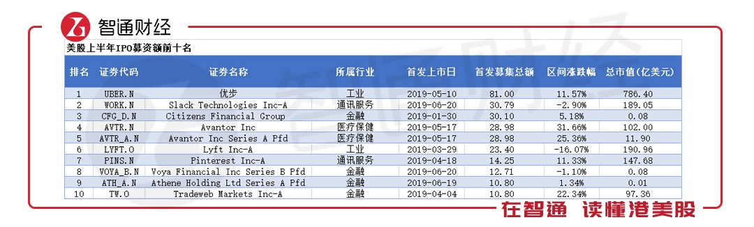 根据可统计数据,美国股市2019年上半年共迎来230只新股上市,其中共有11只新股募资额超过10亿美元。
