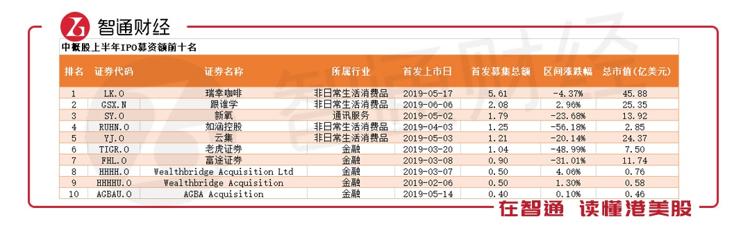 相比2019年上半年来看,较受瞩目的瑞幸咖啡、跟谁学、如涵、富途证券、老虎证券等均主要集中在消费品行业、金融行业。