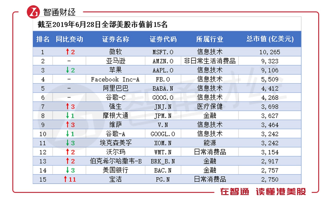 个股来看,所有美股市值前15名排名未出现明显变化。其中,宝洁(PG.US)为其中排名上涨最快的标的,与去年同期相比排名上涨11名。微软(MSFT.US)为市值排名第一的企业,与去年同期的苹果(AAPL.US)发生互换。