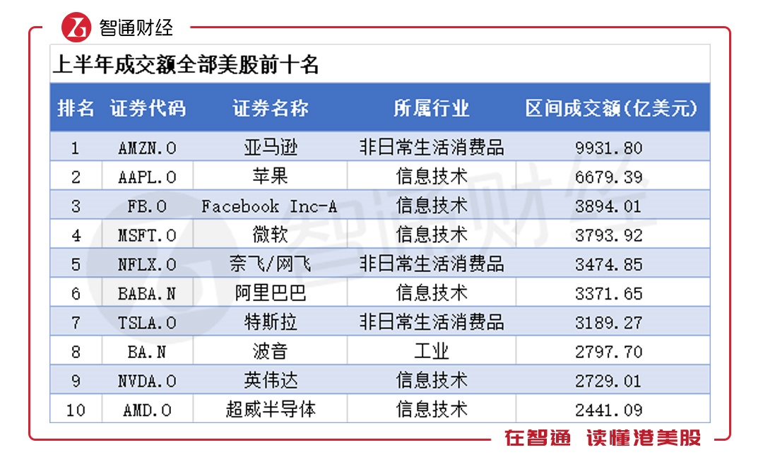 自年初至6月28日期间,亚马逊(AMZN.US)为成交额排名第一,成交额9932亿美元与第二名的苹果(AAPL.US)拉开较大差距,为上半年最受资本关注的企业。