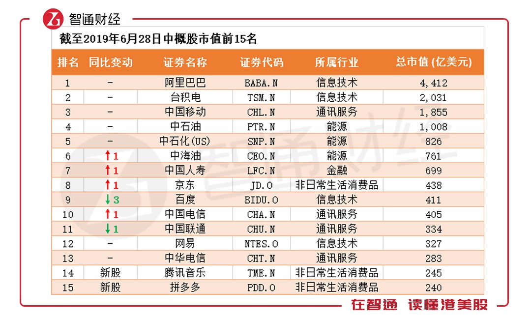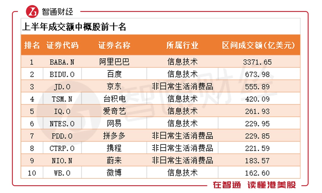 从年初至6月28日期间的成交额来看,阿里巴巴(BABA.US)、百度(BIDU.US)、京东(JD.US)、台积电(TSM.US)、爱奇艺(IQ.US)5只标的为上半年受到资本关注最多的企业。与所有美股成交额前10名企业的行业分布类似,排名靠前的企业均来自TMT行业。