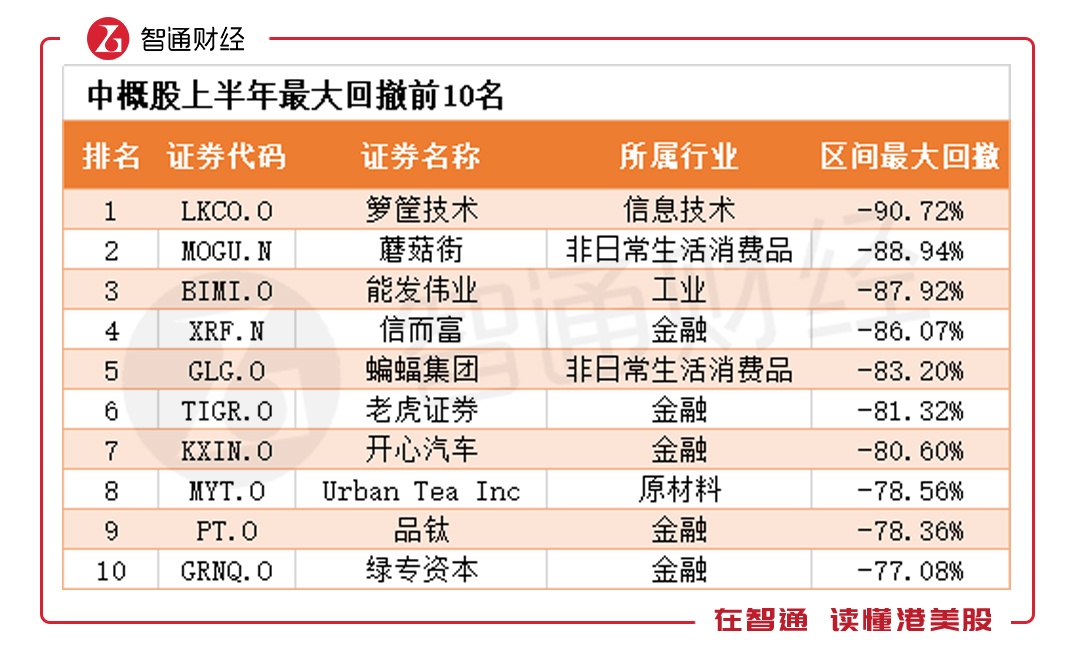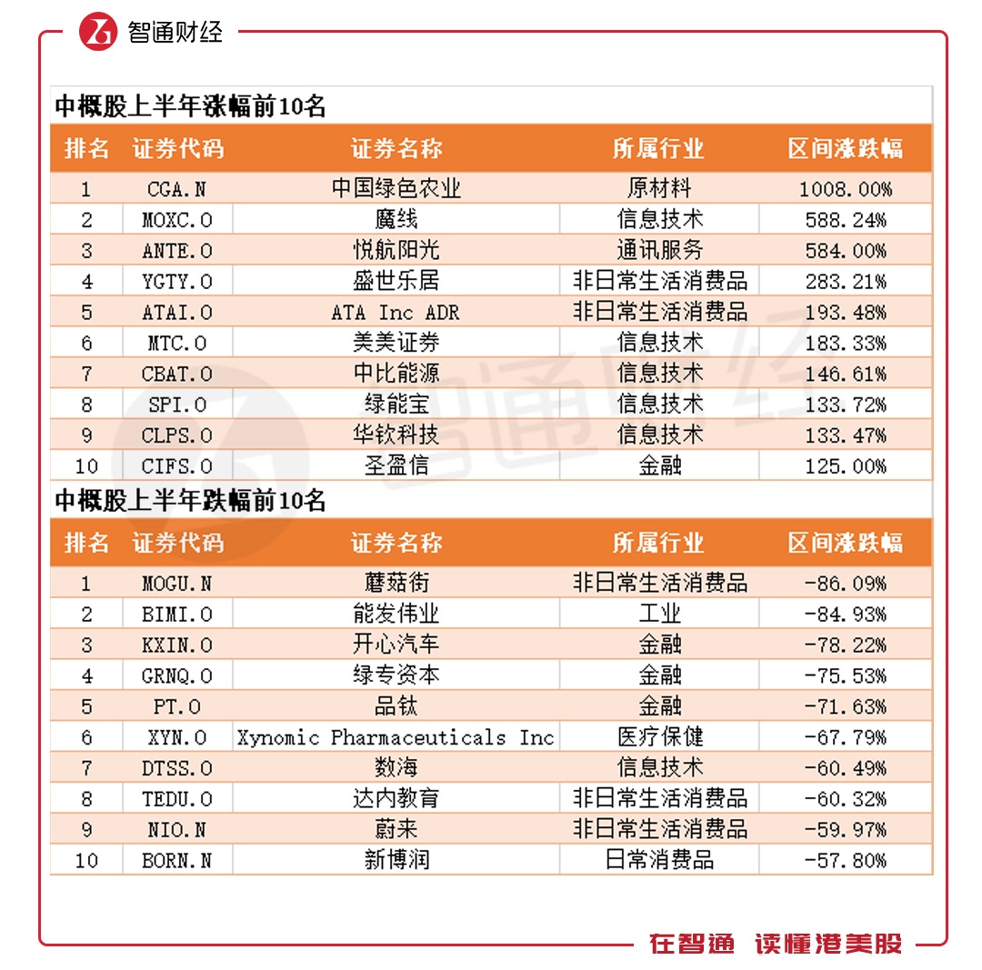 从涨跌幅排名来看,截至2019年6月28日,中国绿色农业(CGA.US)、魔线(MOXC.US)、悦航阳光(ANTE.US)为涨幅最大的三家企业。相比而言,蘑菇街(MOGU.US)、能发伟业(BIMI.US)、开心汽车(KXIN.US)为上半年下跌最多的三家企业。蘑菇街(MOGU.US)成为上半年下跌最惨中概股。