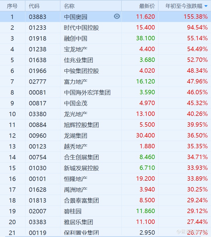放缓已是既定的事实,但反观二级资本市场,内房股并没有像销售数据一样势头减弱,反而顽强向上,大部分个股跑赢了大盘,内房股板块今年以来上涨18.6%,高于恒指11.3%的涨幅,反映市场已经对楼市放缓已有充分预期,此外,流动性和行业政策相对宽松也带动了板块估值修复。