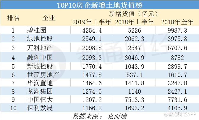 在加快工期的同时,房企拿地与去年比相对谨慎,整体拿地销售比有所下滑。据克而瑞数据,拿地最多的依然是龙头企业,今年上半年,销售前十的房企新增货值全部超过千亿,其中,碧桂园、绿地控股、万科分列前三,均超2000亿元,碧桂园更是以超过4200亿元的新增货值遥遥领先。
