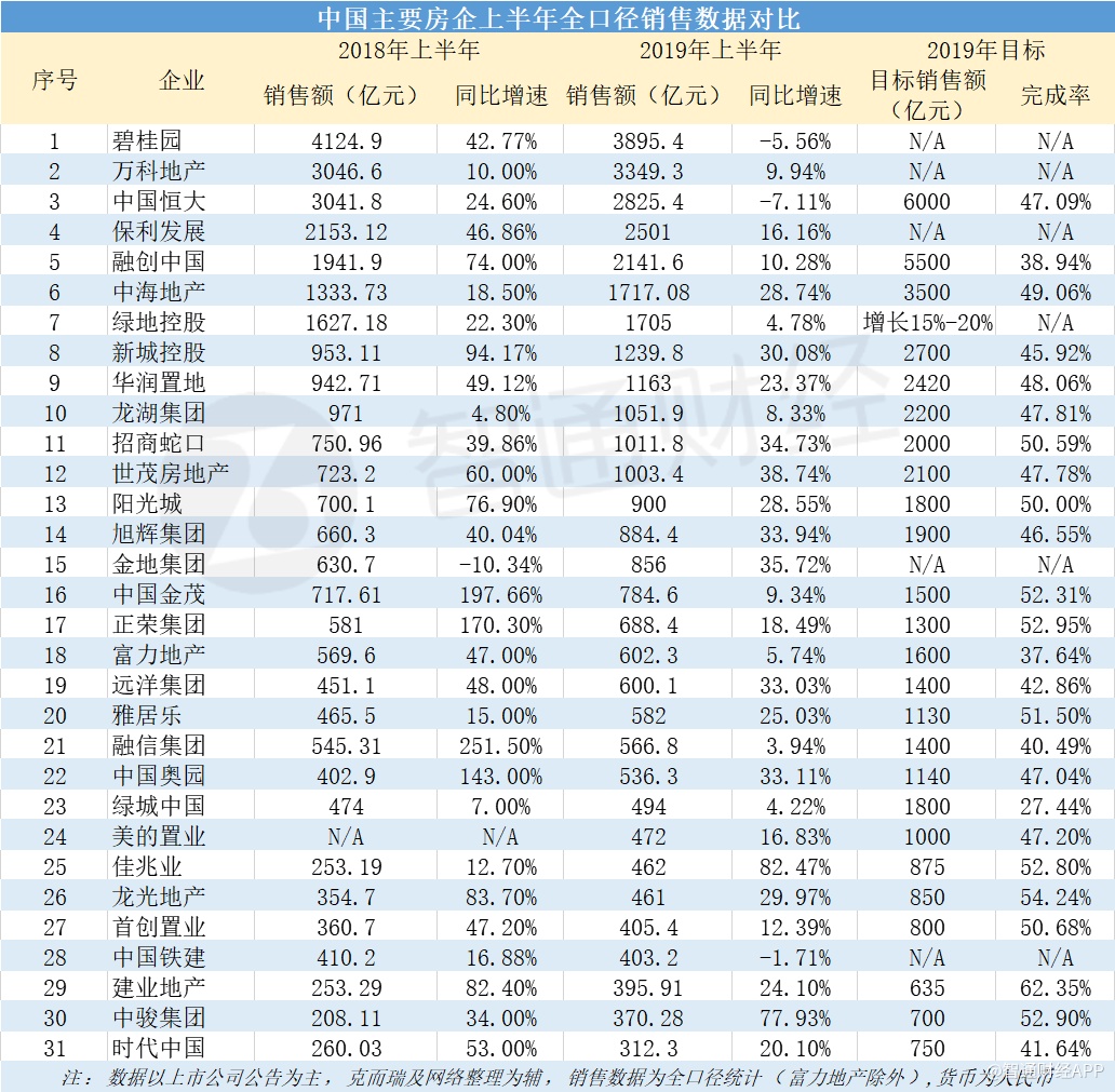 整体而言,尽管2019年房企制定的目标相对谨慎,但目标完成情况依旧不及去年上半年。