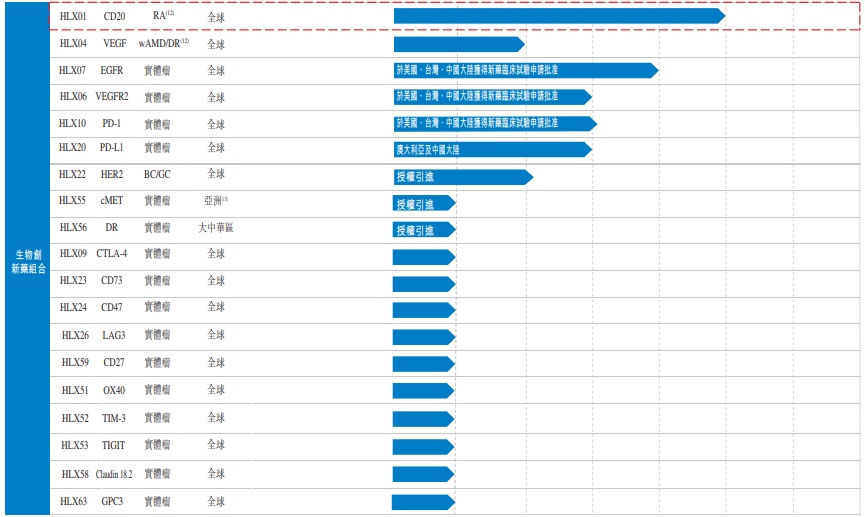 下表概述截至最后实际可行日期的产品及候选药物管线