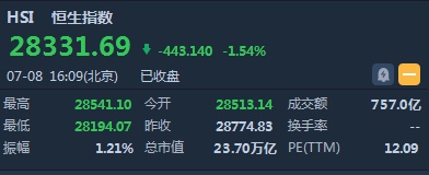 智通财经APP获悉,恒指早盘低开0.91%,报28513.14点。截至收盘,恒生指数跌443.14点或1.54%,报28331.69点,全日成交额达757.05亿。国企指数跌1.56%,报10725.2点,红筹指数跌1.59%,报4447.67点。