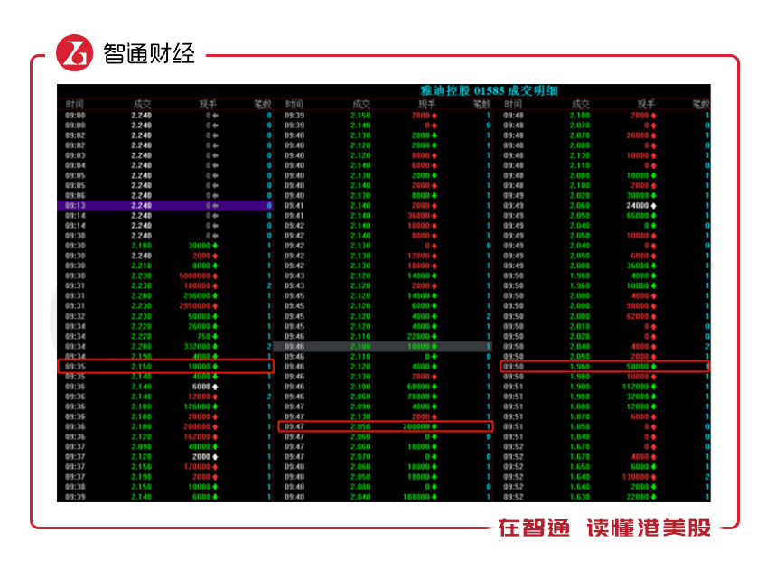 智通财经APP透过雅迪控股的成交明细了解到,在90:30分和9:31分分别有500万股和295万股均是一笔成交,成交价均为2.23港元,合计成交额1772.85万元。然而,在9:35分,某位投资者以1万股把价格压制2.15港元,9:47分以20万股压至2.05,之后瀑布式下跌,10:19分股价跌幅近60%。