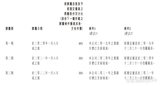 据公司公告显示,此次股份奖励将于2020-2022年1月8日或之后共分3次归属期发放,奖励股份发放予经选定雇员条件分别为公司全面达成2019-2021年业绩目标。