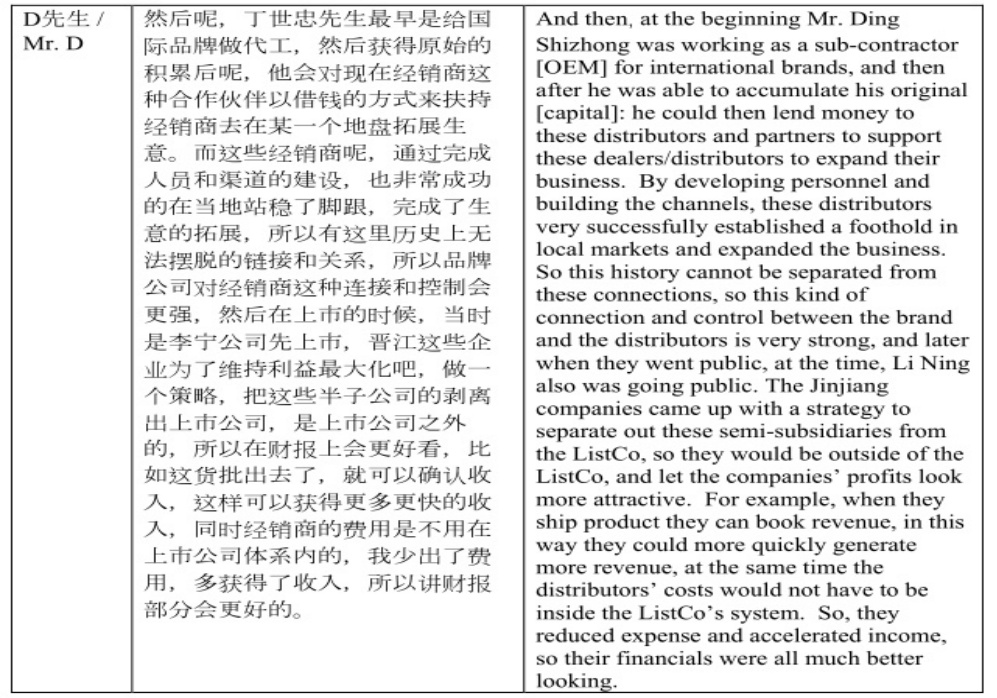 为了佐证其观点,浑水在报告中还披露了与四位参与分销的安踏前高级经理,以及一位大型分销商“广州市安大贸易发展有限公司”的前高级经理的交谈记录。浑水称,这五位被称为A、B、C、D和E的先生,一致确认安踏控制了分销商。