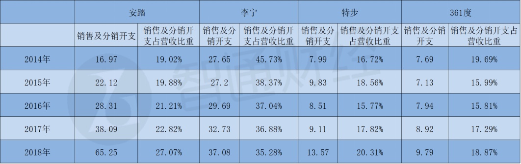 事实是,根据港股四大体育用品公司的财报数据,安踏的销售及分销开支过往五年呈现逐步增大的趋势,2018年达到65.25亿元人民币(下同),数值远远高于其他三家,销售及分销开支占营收比重为27.07%。2018年,四家公司中经销开支占比最高的为李宁(02331),达到35.28%,特步(01368)和361度(01361)的销售及分销开支分别为21.26%和18.87%均大幅低于安踏。