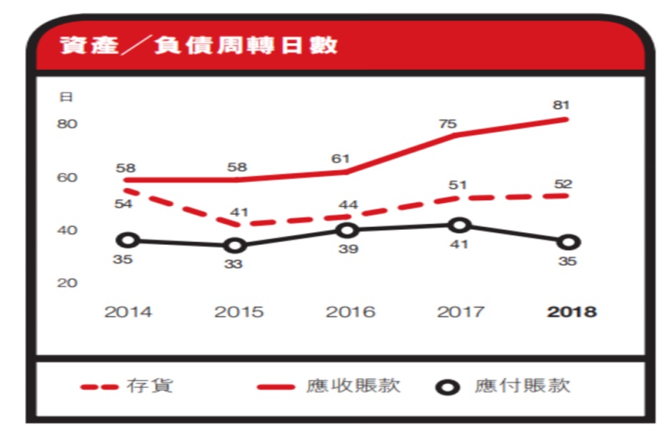2018年安踏的应收贸易账款金额为25.05亿元,占总收入比重10.39%,如果加上21.33亿元的其他应收款项,安踏应收账款及款项总额为46.38亿元,占营收比重19.24%。其他三家公司中,李宁的应收贸易账款金额最低为9.29亿元,占营收比重8.84%,特步和361度的应收账款分别达到19.53亿元和23.04亿元,占营收比重30.6%和44.42%。如果其他三家的数据是正常且合理的,那么安踏的数据似乎没有太大不合理之处。不过需要注意的是,安踏2018年的应收账款周转天数达到81天,近四年来逐年升高倒也值得玩味。