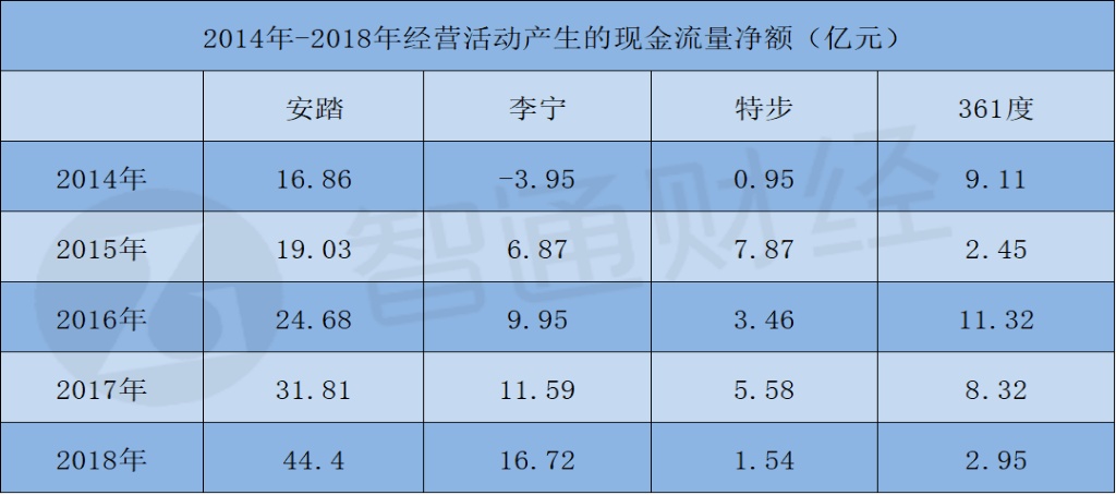 再来看现金情况,从财务表报层面来看,安踏最引以为傲的大抵就是公司的现金流了。2014年至2018年,安踏经营活动产生的现金流量净额从16.86亿元逐年增长至44.4亿元。慢慢熬出头的李宁2018年经营活动产生的现金流量净额达到16.72但也不及安踏一半,而特步和361度的经营活动现金流量净额还不到安踏的零头。