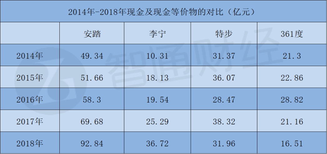 有稳定经营现金流,安踏账上现金及现金等价物于2018年达到92.84亿元,远远高出李宁的36.72亿元、特步的31.96亿元及361度的16.51亿元。