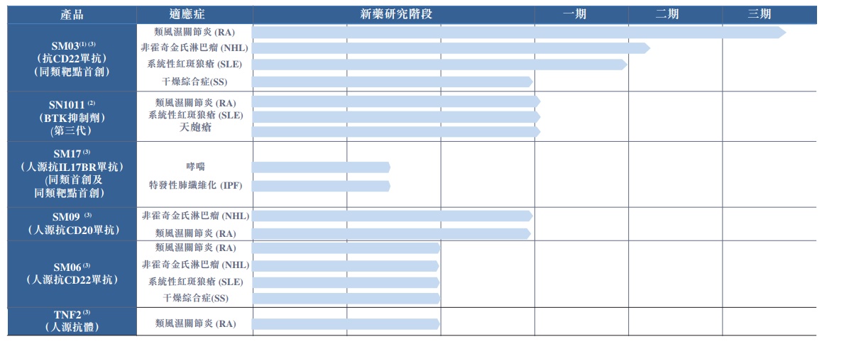 招股书称,SM03是全球同类靶点中首款及唯一一款用于治疗RA的CD22单抗药物,有别于其他治疗类风湿关节炎的常规生物制品(例如TNF-α、IL-6、IL17及CD20为靶向的单克隆抗体)。SM03目前在中国进行RA适应症的III期临床试验,该公司计划将于2019年年底前完成受试患者的招募。与此同时,该公司已完成SM03治疗系统性红斑狼疮及非霍奇金淋巴瘤的I期临床试验,并计划于2020年在中国启动针对系统性红斑狼疮的II期临床试验。