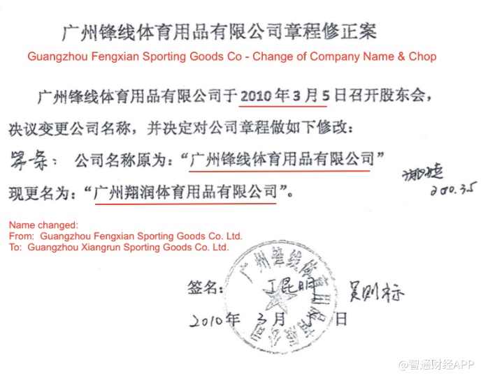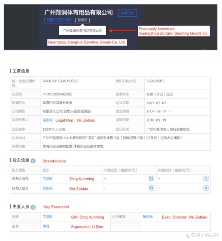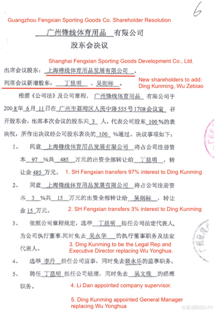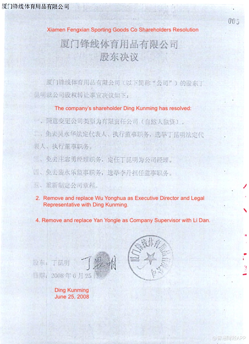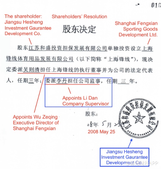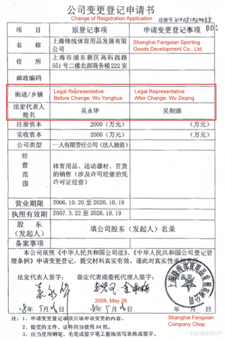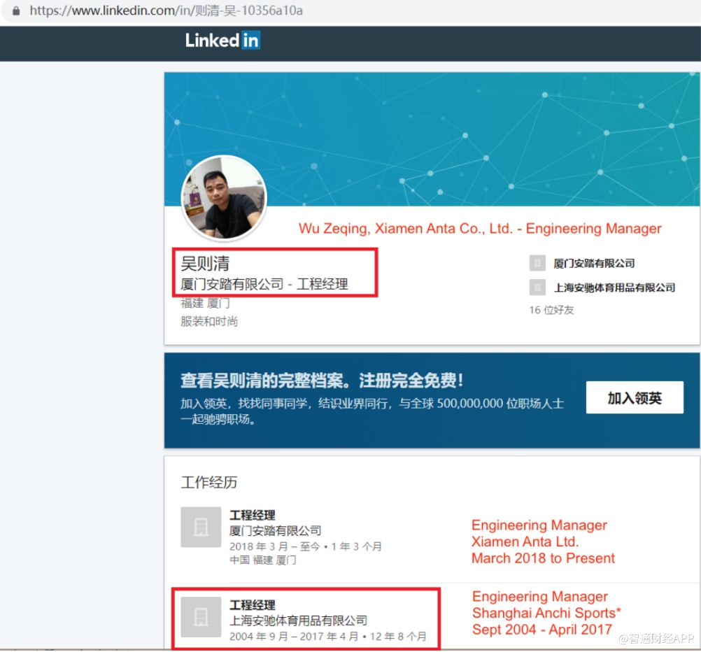 和盛于2008年5月(收购后不久)任命吴则清为上海锋线的法定代表人。根据其领英(LinkedIn)简介,吴则清当时是上海安驰的雇员,在招股说明书中披露为关联方。上海安驰正是我们第一份做空报告中受安踏体育控制的“分销商”子公司。根据吴的领英简介,他现在为安踏工作。
