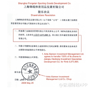 2008年5月份,安踏宣布以1.874亿元人民币的价格处置上海锋线。然而,其中的1.814亿元人民币(占99.5%)用于支付上海锋线所欠的应收款项。