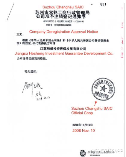 交易受让方是一家相对较新的信用担保公司,名为江苏和盛投资担保发展有限公司,也是一家在此次交易中很明显被利用的壳公司。和盛随后将锋线转手给了另一个第三方,并在6个月后(2010年10月份)注销了公司。