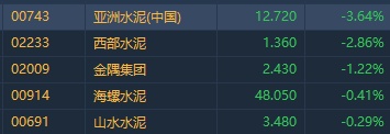 智通财经APP获悉,今日大市再度回调,前期持续强势的水泥股亦跟随走弱。截至发稿,亚洲水泥(中国)(00743)跌3.64%,西部水泥(02233)跌2.86%,金隅集团(02009)跌1.22%。