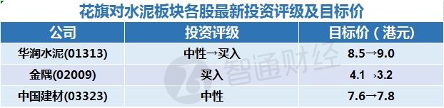 智通财经APP获悉,花旗发表研究报告称,受惠于住宅建筑需求和水泥价格比较基数偏低,预计上半年整体水泥企业业绩会有强劲表现。随着基建需求改善,下半年水泥需求将会维持稳定,而华南地区上半年需求受到降雨影响,预计下半年会相较落后。该行预计海螺水泥(00914)和中国建材(03323)中期业绩强劲,而华润水泥(01313)次季盈利跌幅收窄,且会在下半年转势,该行将其评级由“中性”升至“买入”,目标价由8.5港元上调至9港元。该行同时将金隅(02009)从首选名单中剔除,因其物业合约销售透明度不高。