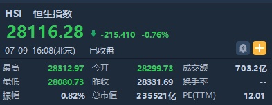截至收盘,恒生指数跌215.41点或0.76%,报28116.28点,全日成交额达703.25亿。国企指数跌0.7%,报40650.63点,红筹指数跌0.78%,报4413.19点。