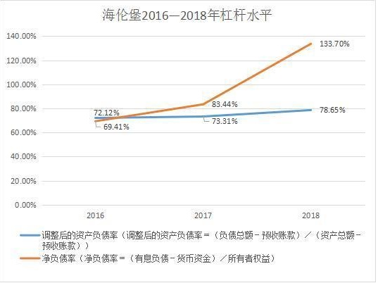 海伦堡的债务在近三年来看也是逐年加重。调整后的资产负债率由2016年72.12%上升至2018年78.65%,净负债率也由2016年69.41%增至2018年133.7%,两项指标均超过了行业中位数。