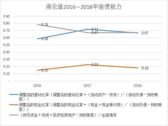 海伦堡反映短期偿债能力的指标近三年均出现先升后降的趋势。2018年,海伦堡调整后的速动比率由2017年的0.72降至0.67,调整后的现金比率由2017年的0.23降至0.18,两项指标均位于行业1/4分位数之下,反映出海伦堡较差的短期偿债能力。