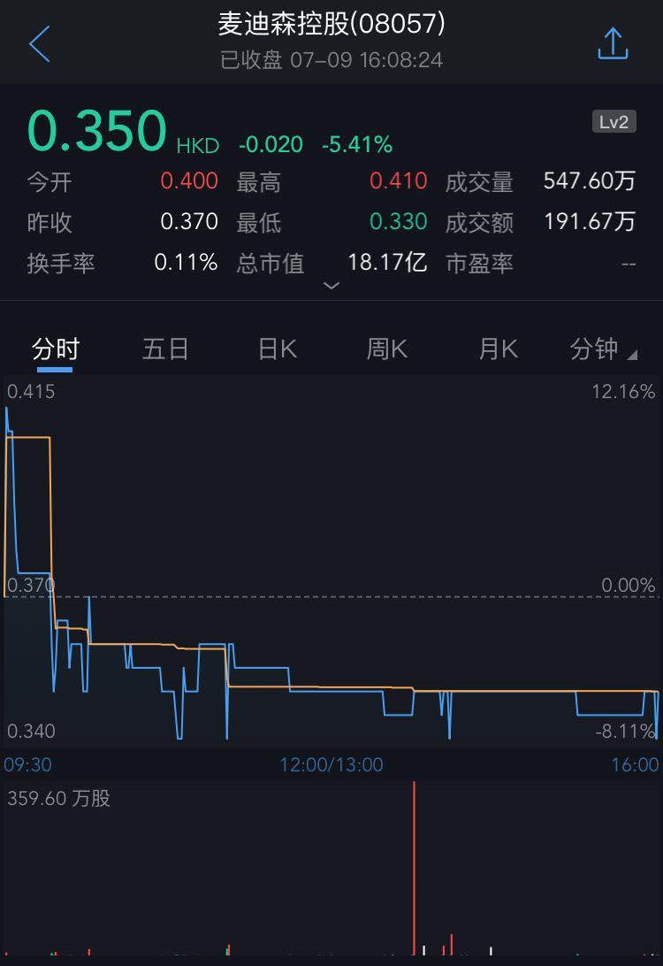 截至今日收盘,麦迪森控股(08057)跌5.41%,报0.35港元。