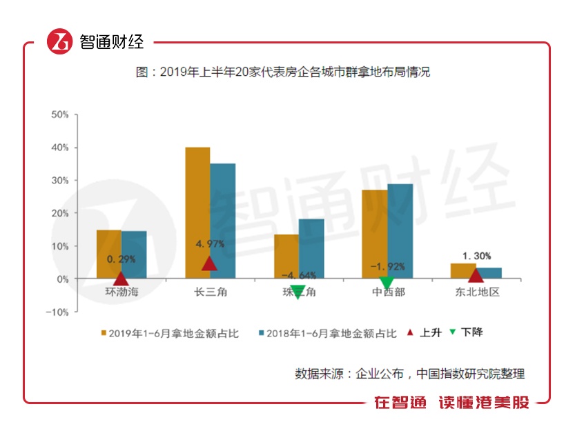 如从今年上半年20家代表房企各城市群拿地布局情况来看,长三角地区热度依旧,拿地金额同比增长29.4%,占比达40.1%,相对而言,环渤海及中西部地区拿地金额分别同比增长15.6%、5.9%,珠三角拿地金额同比下降15.7%。