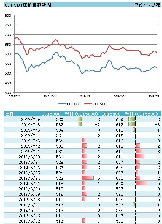 7月9日中国煤炭资源网最新一期的CCI动力煤价格显示,CCI5500动力煤价格报609元/吨,较上期价格继续回调3元/吨,较上月同期价格上调13元/吨或2.2%;CCI5000动力煤价格报530元/吨,较上期价格下调2元/吨,较上月同期价格水平上调19元/吨或3.7%。