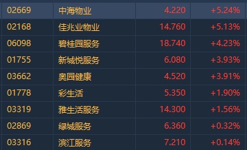 智通财经APP获悉,物业管理板块早盘再度走强,截至发稿。永升生活服务(01995)涨16.29%,中海物业(02669)、佳兆业物业(02168)涨超5%,碧桂园服务(06098)涨4.23%,新城悦(01755)、奥园健康(03662)涨近4%。