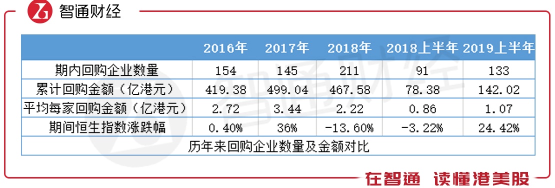 不过,2019年上半年的数据则有所不同。期内恒生指数涨幅10.43%,明显优于2018年上半年的-3.22%,但企业回购数量为133家,较2018年同期高出46%。