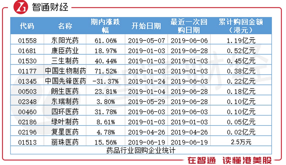 智通财经APP发现,药品是回购企业数量最多的行业,多达11家,占比8.2%。2018年时,由于一致性评价、两票制的影响,药品行业“大杀”估值,企业股价大幅下跌。而至2019年上半年,行业的悲观情绪有所缓和,优质股凭借良好基本面,在回购利好的刺激下,估值修复快速修复。