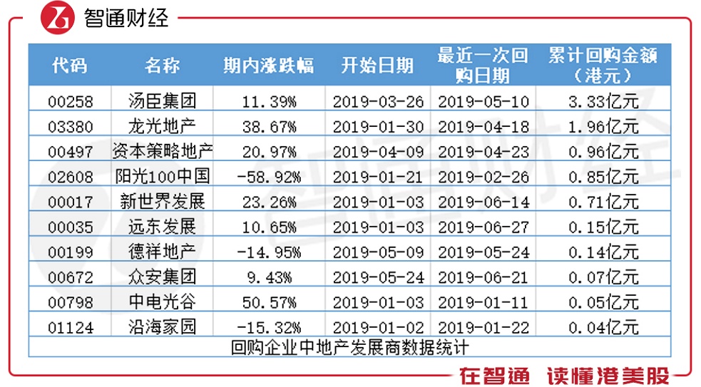 药企之后,回购的主力之一便是地产发展商。2019年上半年,地产发展商的回购企业数量达10家,占比7.5%。在2018年前所未有的密集调控下,房地产行业经历了寒冬,股价开启“戴维斯双杀”。