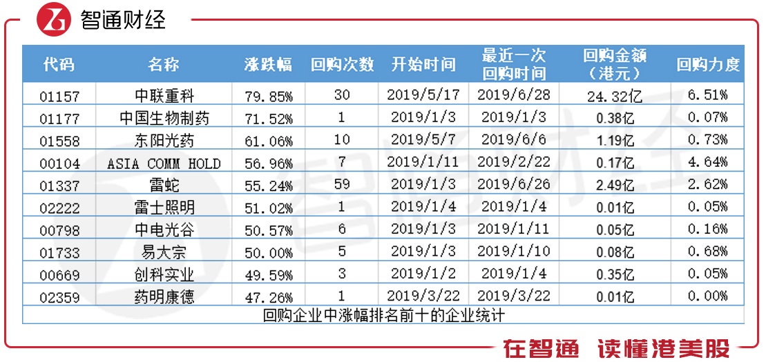 从涨幅来看,回购企业中股价涨幅排名前十的公司大幅跑赢恒指,最出彩的为中联重科(01157),涨幅79.85%,即使排在第十名的药明康德(02359),涨幅也高达47.26%。