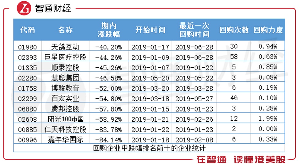 天鸽互动(01980)2019年上半年回购次数高达30次,股价却跌超40%;创科实业(00669)仅回购3次,股价便涨近50%;更有甚者,股价创新高之际仍选择回购。