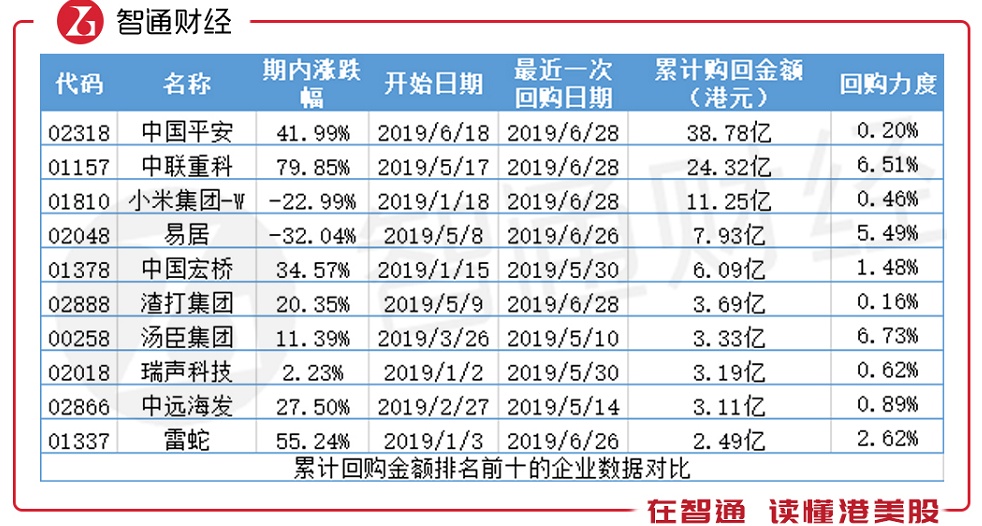 而累计回购金额的前三甲分别为中国平安(02318)、中联重科、小米集团(01810),在短短11天中,中国平安(回购A股股份)便以38.78亿港元的累计回购金额夺得上半年累计回购金额的NO.1。