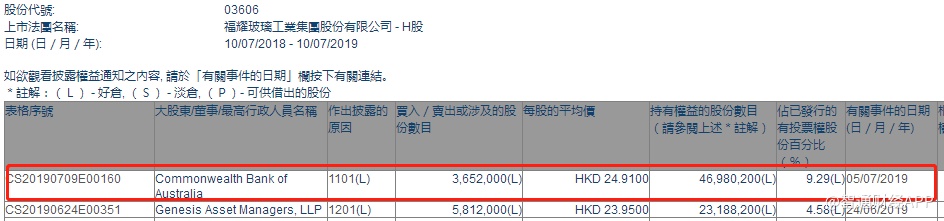 智通财经APP获悉,根据联交所资料显示,澳洲联邦银行于7月5日增持福耀玻璃(03606)365.2万股,每股作价24.91港元,总值9097.13万港元,最新持股数目4698.02万股,最新持股比例为9.29%。