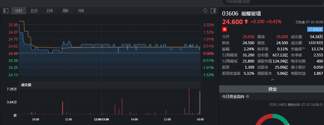 截至今日收盘,福耀玻璃(03606)涨0.41%,报24.60港元。