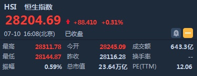 智通财经APP获悉,恒指早盘高开128.81点或0.46%,报28245.09点。截至收盘,恒生指数涨88.41点或0.31%,报28204.69点,全日成交额达643.33亿。国企指数涨0.48%,报10701.92点,红筹指数涨0.96%,报4455.36点。
