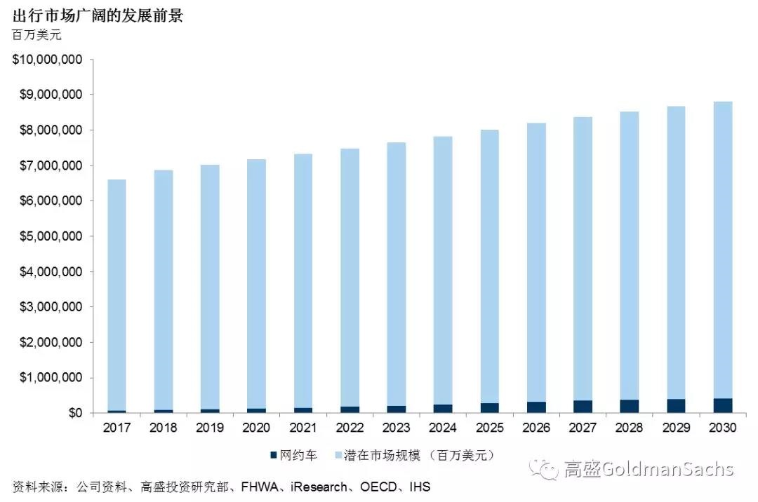 尽管无法汇总成一个简单的数字,但高盛预计现时潜在规模超过7万亿美元的出行市场将在未来十年为投资者、现有企业、政府和企业家在“新出行市场”中创造商机。我们定义“新出行市场”由数个现有市场、应用场景、服务以及其他未知形态构成。最初期的市场变化包括对出租车和传统租车的取代。这个市场的总收入规模估算将从2018年的逾900亿美元增至十年后的3,750亿美元,年均复合增长率为15%。到2030年,公共交通的替代、传统购车模式更迭和微出行的总计将占7万亿美元交通市场的5%左右。送餐服务、货运、最后一公里物流也将发生相应的改变。