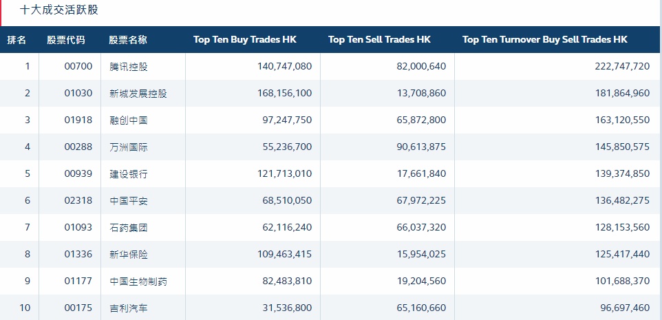智通财经APP获悉,7月10日港股市场,北水净流入11.44亿元。北水净买入最多的个股依次是新城发展控股(01030)、中生制药(01177)、安踏(02020),净卖出最多的个股依次是万洲国际(00288)、金风科技(02208)、中国建材(03323)。