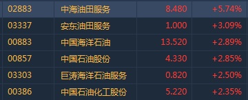 智通财经APP获悉,因国际油价涨势强劲,推动港股石油股全线走高。截至10时41分,中海油服(02883)涨5.74%,安东油田(03337)涨3.09%,中海油(00883)2.89%,中石油(00857)涨2.85%,中石化(00386)涨2.35%。