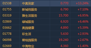 智通财经APP获悉,中期业绩期到来,物业管理板块热度不减,相关个股频发盈喜。截至11时21分,中澳到家(01538)涨13.24%,新城悦(01755)涨7.1%,雅生活服务(03319)涨6.95%,绿城服务(02869)涨6.46%,奥园健康(03662)涨5.39%,彩生活(01779)涨2.93%,碧桂园服务(06098)涨2.67%。