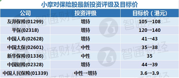 智通财经APP获悉,小摩发表研究报告称,预期2019年上半年保险股盈利复苏,整体约上升23%,因此调整其整体目标价,除中国财险(02328)目标价有所调低外,大部份均上调目标价。该行上调中国人民保险(01339)评级,由“中性”升至“增持”,看好非人寿承销前景,以及在低基础下,人寿业务潜在复苏。至于友邦保险(01299),估计上半年新业务价值实际汇率计算同比上升15%,中期息每股派33.3港仙。预测中国人寿(02628)或发盈喜,初步预计上半年国寿纯利同比或升135%。