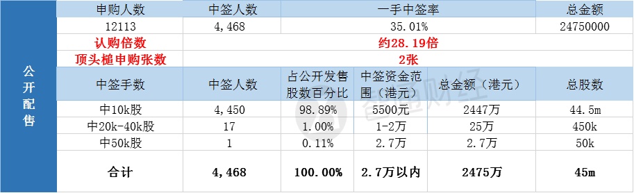 其中,公开配售申购人数为12113,一手中签率35.01%,认购倍数约28.19倍。