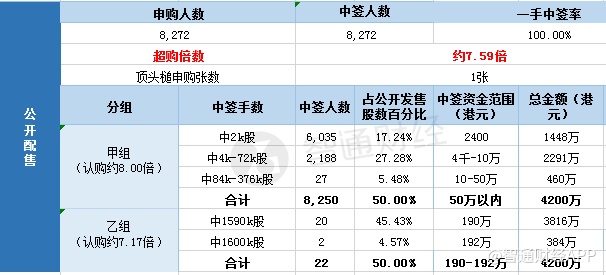 其中,公开配售申购人数8272,一手中签率100%,超购倍数约7.59倍。