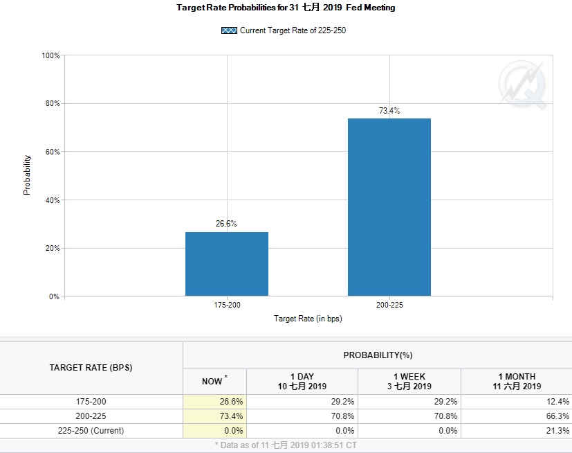 CME Fed Watch Tool最新数据显示,市场预期美联储于7月降息的概率维持在100%。至于利率下调幅度,降息25基点的概率为73.4%,降息50基点的概率为26.6%。