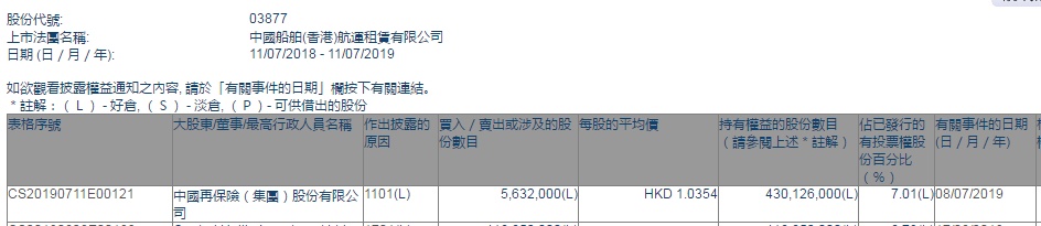 智通财经APP获悉,根据联交所资料显示,中国再保险(集团)股份有限公司(01508)于7月8日增持中国船舶租赁(03877)563.2万股,每股平均作价1.0354港元,总价值约583.13万港元,最新持股数增至4.3亿股,最新持股比例增至7.01%。