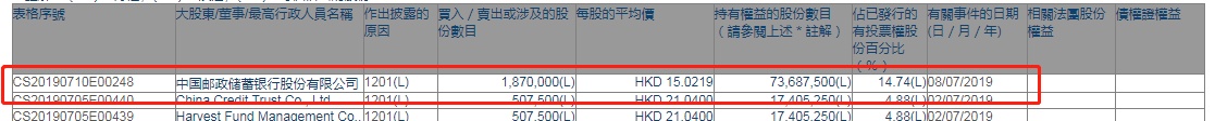 智通财经APP获悉,根据联交所资料显示,中国邮政储蓄银行股份有限公司(01658)于7月8日减持山东黄金(01787)187万股,每股作价15.02港元,总价值约2808万港元,最新持股数减至7368万股,最新持股比例减至14.74%。